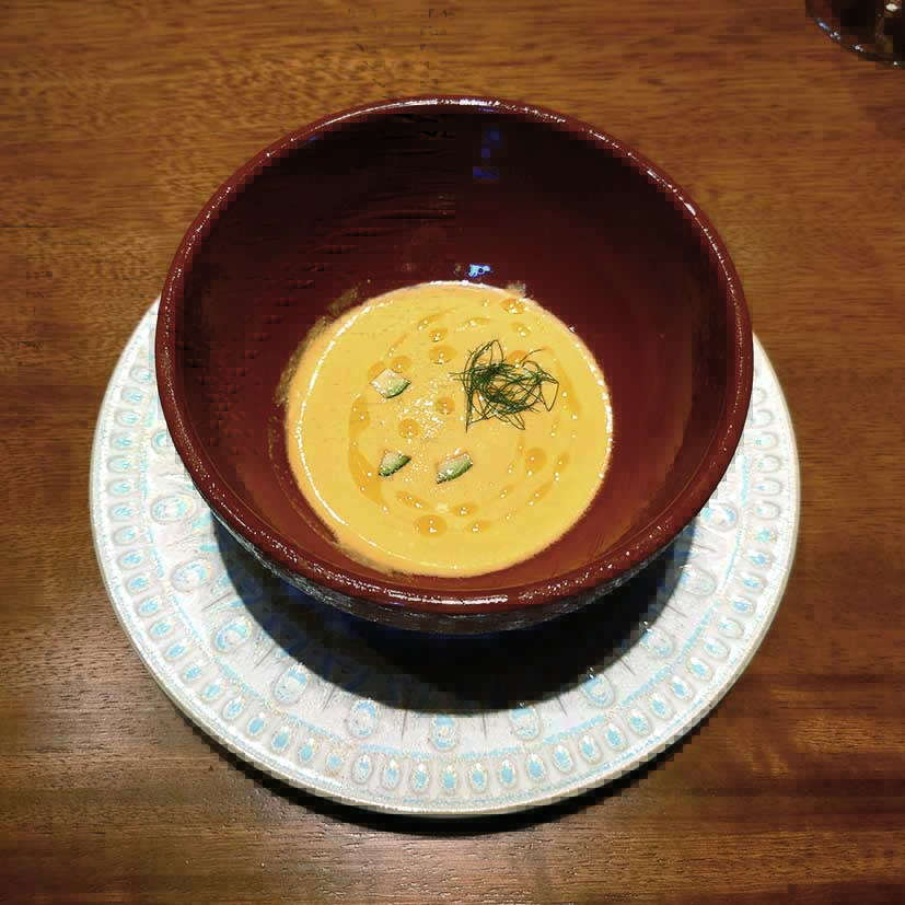 マスクメロンのスープと聞くと『すごく甘い』か、あるいは『めちゃくちゃ甘い』のではとイメージしましたが、淡い酸味を感じる程度にビネガーで調整され、見事に甘みとの調和が取られています。