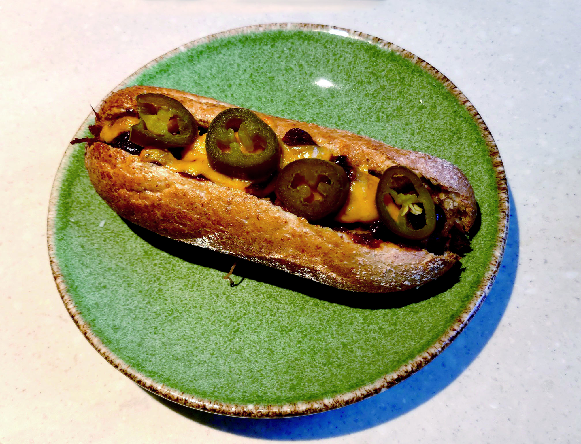 ずはホットの『プルドポークホットサンド』が冷めないうちに。ホロホロのプルドポークとバーベキューソースのワイルドな風味、とろけるチェダーチーズの味わいが抜群。厚切りのハラペーニョのピクルスが酸味と辛みでピリッと引き締めます。パンの表面がパリパリに焼かれているのもいいですね。