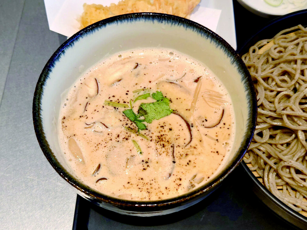 主役はもちろん蕎麦ですが、今日の本題はむしろ『つけ汁』の方です。蕎麦をつけ汁に絡めて食べてみると、たちまち本格的なお蕎麦が『抜群に美味しいクリームパスタ』になります。クリームパスタよりもさらさらとした質感のつけ汁ですが、細切りのお蕎麦によく絡み、しっかりこってり濃厚です。きのこは少なくとも、しいたけ・えのき・しめじの3種が入っていたと思います。ポルチーニ茸のような西洋きのこの香りもあって、ますます『品の良い濃厚きのこパスタ』の様相です。さらに、つけ汁の具材として大きくカットされた鶏肉、こちらはしっとりとしたモモ肉です。
