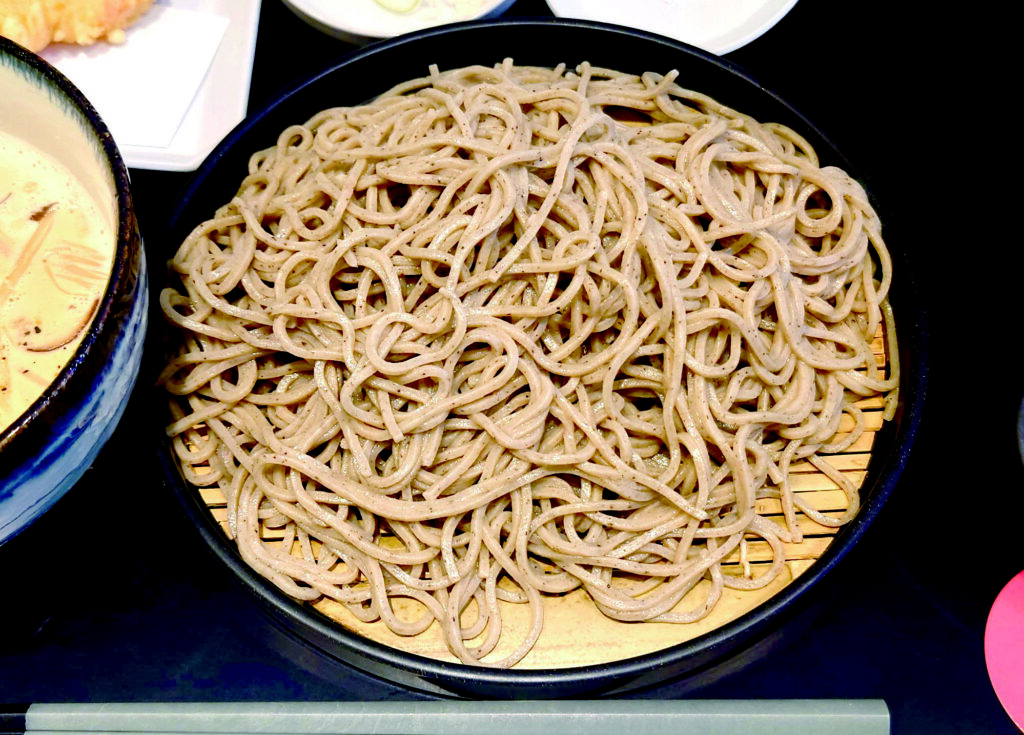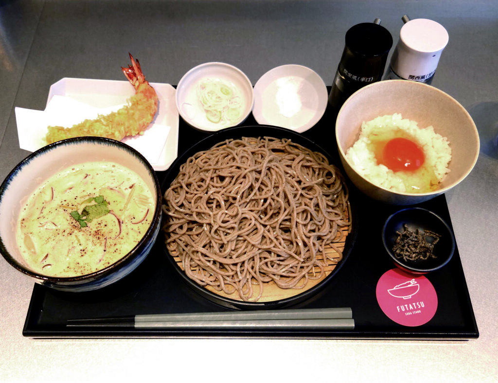 そして、受け取ったトレーの上の情報量もなかなか。まずは中心に主役のお蕎麦。ざるの直径は20cm強だったと思います。お蕎麦の左手がつけ汁です。三つ葉が散らしてありますが、見た目はカルボナーラのようです。左手奥が見てのとおりの『大えび天』で、大きさにして15cmほどもある立派な海老です。お蕎麦の奥の小皿が薬味のネギとお塩。その右手の『玉子かけごはん』には関東風・関西風のお醤油2種と塩昆布が付いており、卵黄に赤みのある『真っ赤卵(まっからん)』というウイスキーみたいなブランド名の卵が目を引きます。